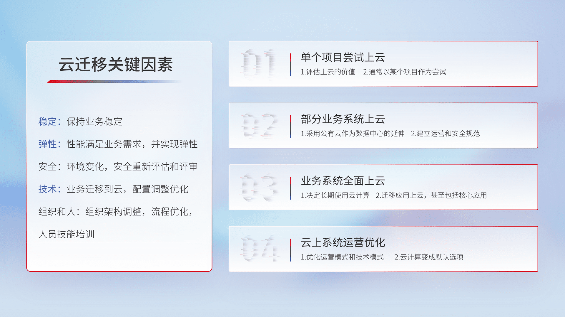 结合实际业务,,,从规划设计、、、、云平台选型、、、云原生改造、、、数据迁移、、集成交付,,,,迁移全过程为客户识别最佳上云路径,,,,做好风险识别管理,,,设计网络架构、、、身份权限、、、、安全审计合规、、、操作审计、、、、日志审计、、监控告警策略、、、、多站点容灾设计等,,,,对云上基础设施进行整体规划,,,提升IT治理水平,,以满足弹性、、高可用、、、、高性能的需求。。。。
